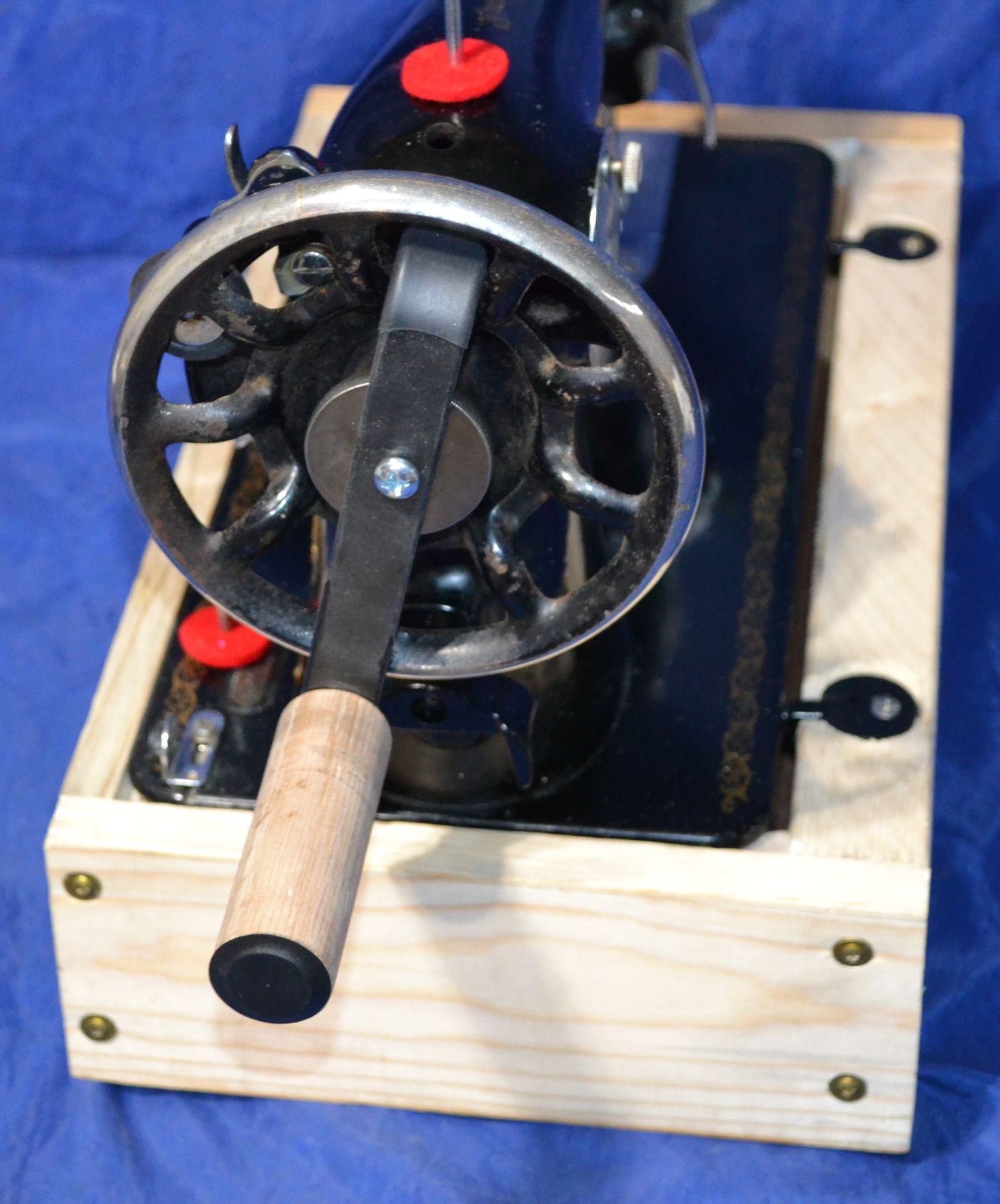 HAS A OAK HANDLE THAT SPINS AS YOU CRANK THE MACHINE MAKING IT EASIER TO USE. IS UNPAINTED SO YOU CAN STAIN OR PAINT OR COVER IT TO YOUR LIKING.
