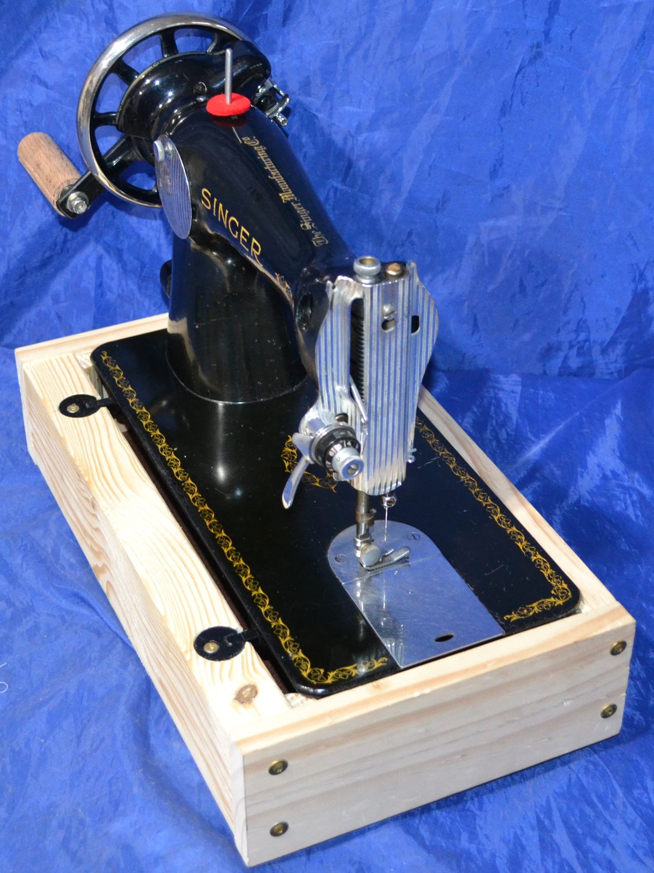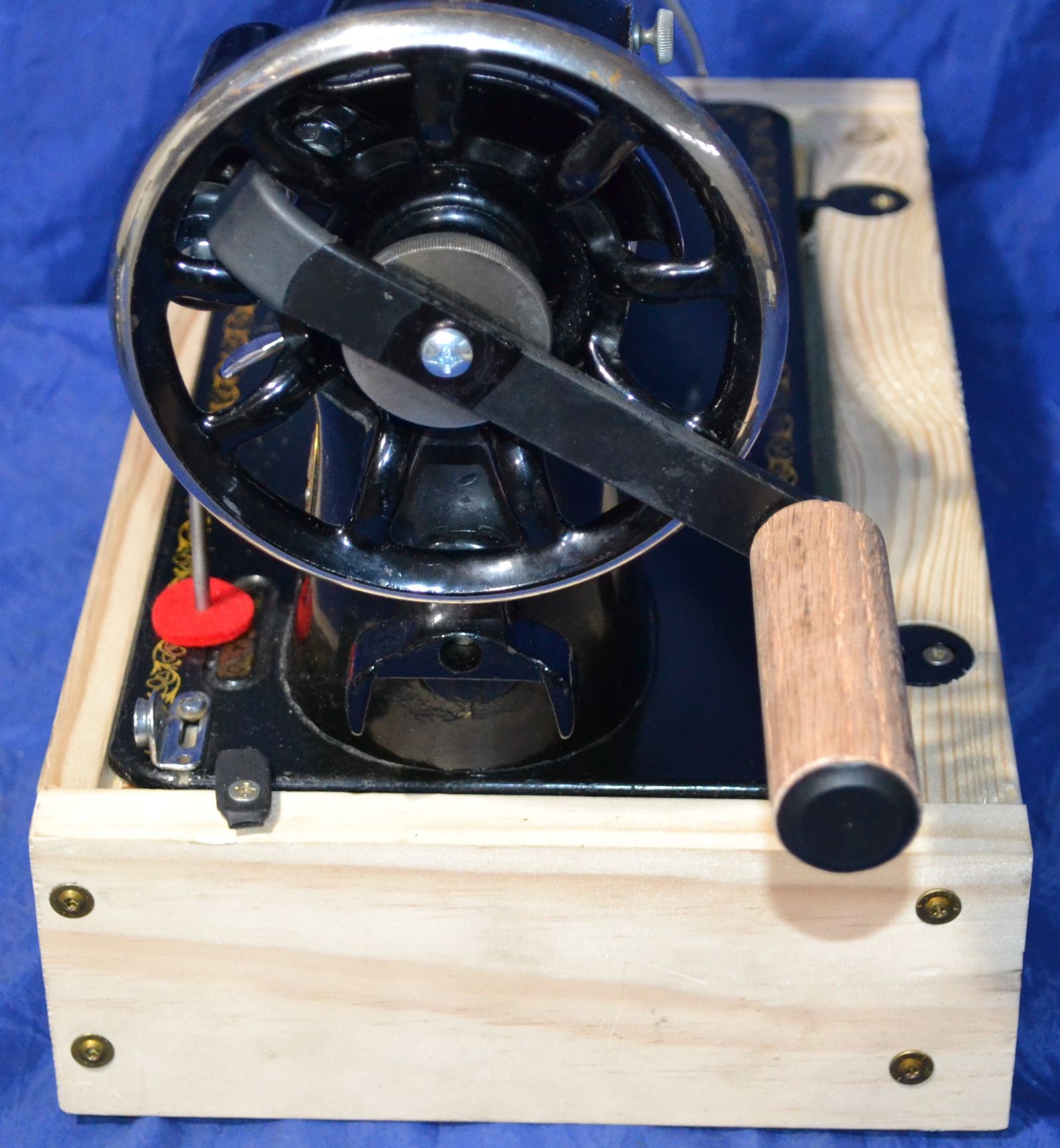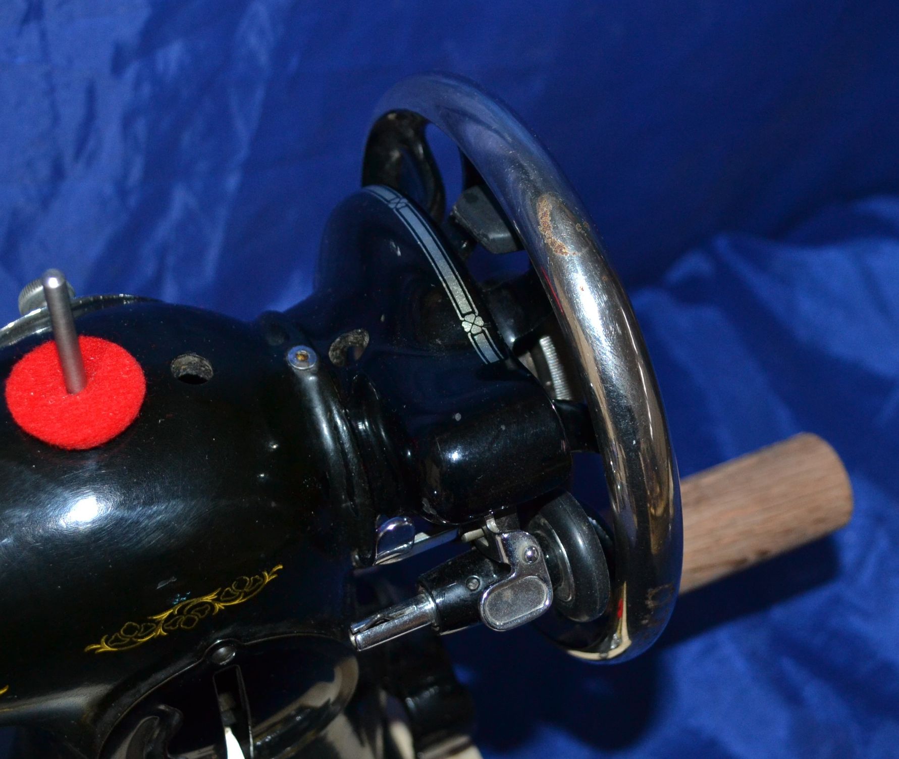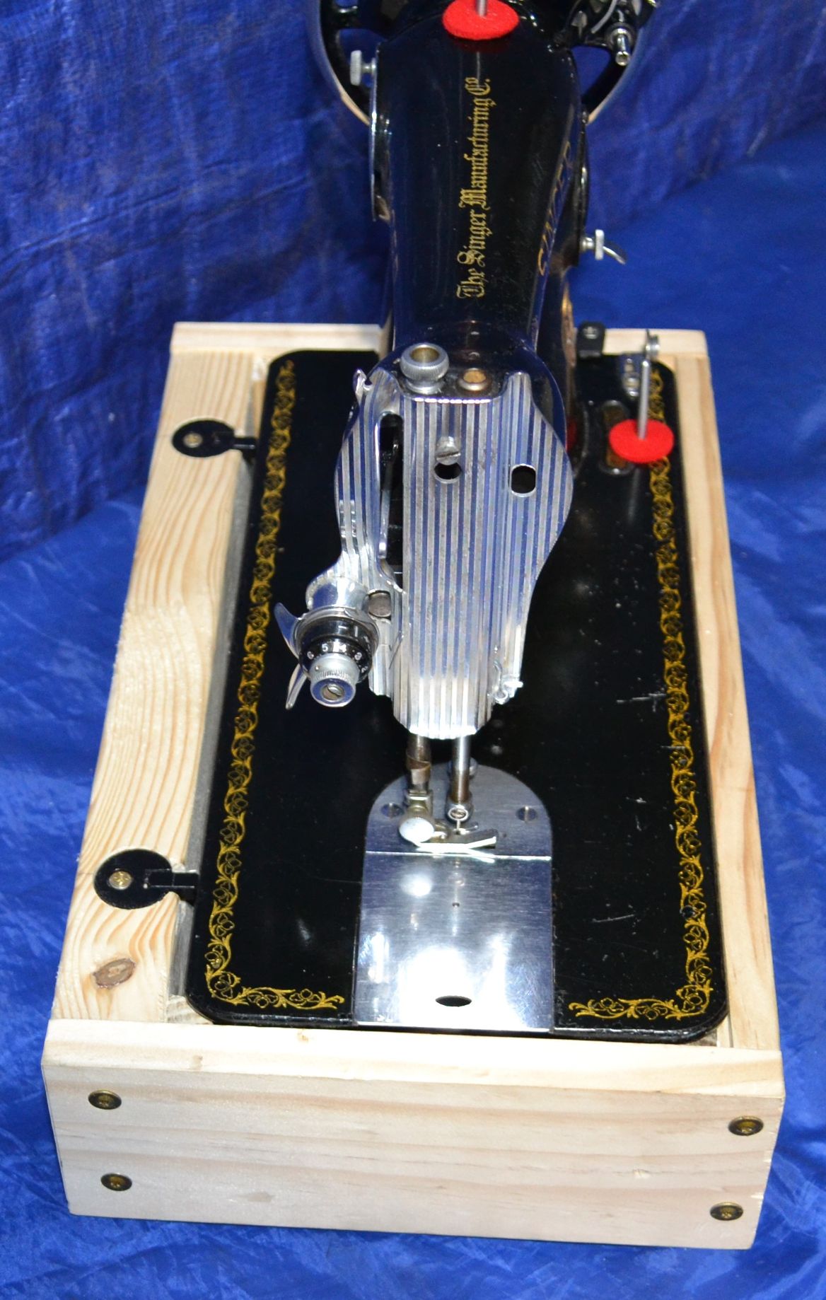 MACHINE HAS BEEN GONE THROUGH NEW RUBBER WHEEL ON BOBBIN WINDER. NEW WOOD BASE W/HINGES, CUSHIONS, HOLD DOWN, BASE CAN BE STAINED, PAINTED TO YOUR LIKING.