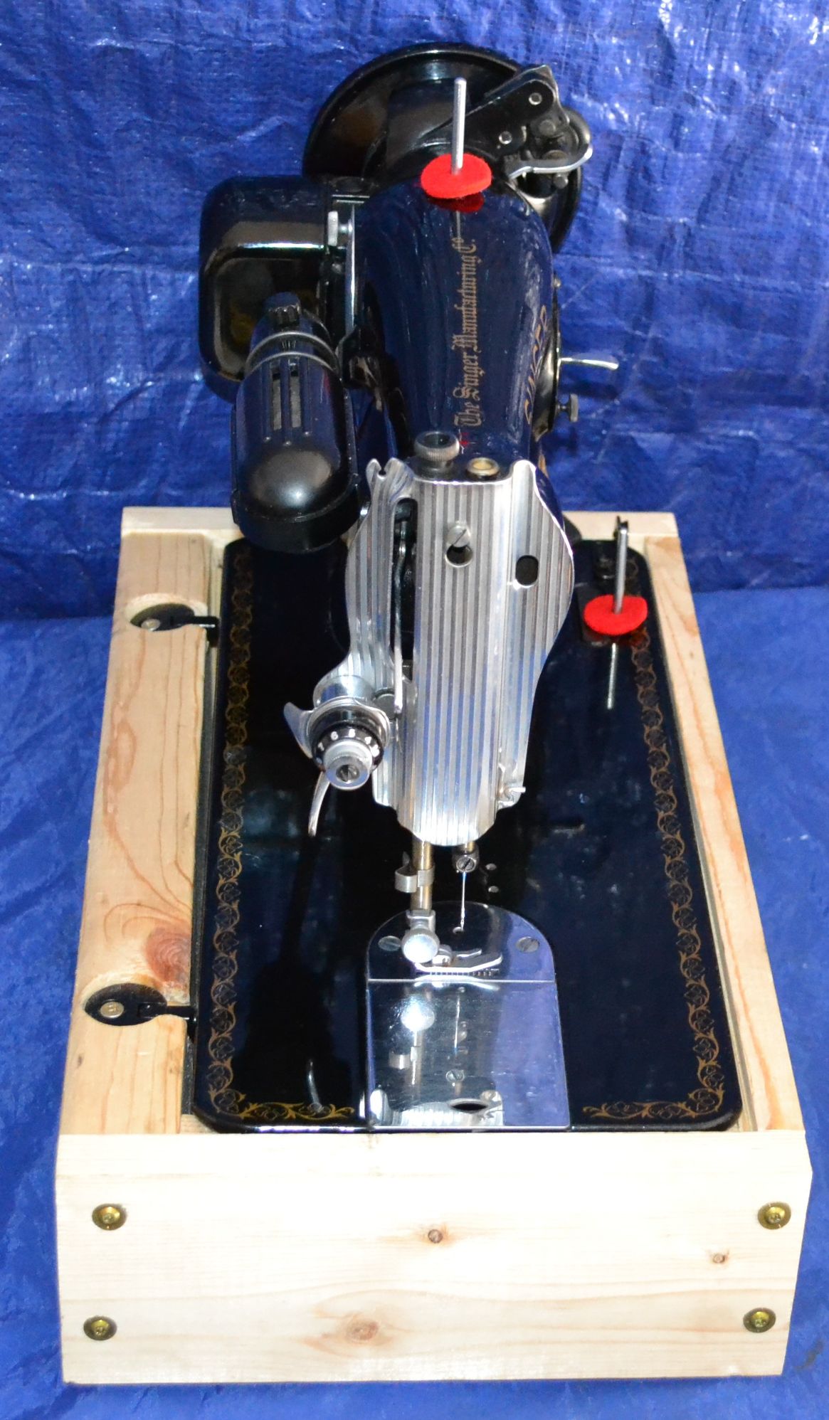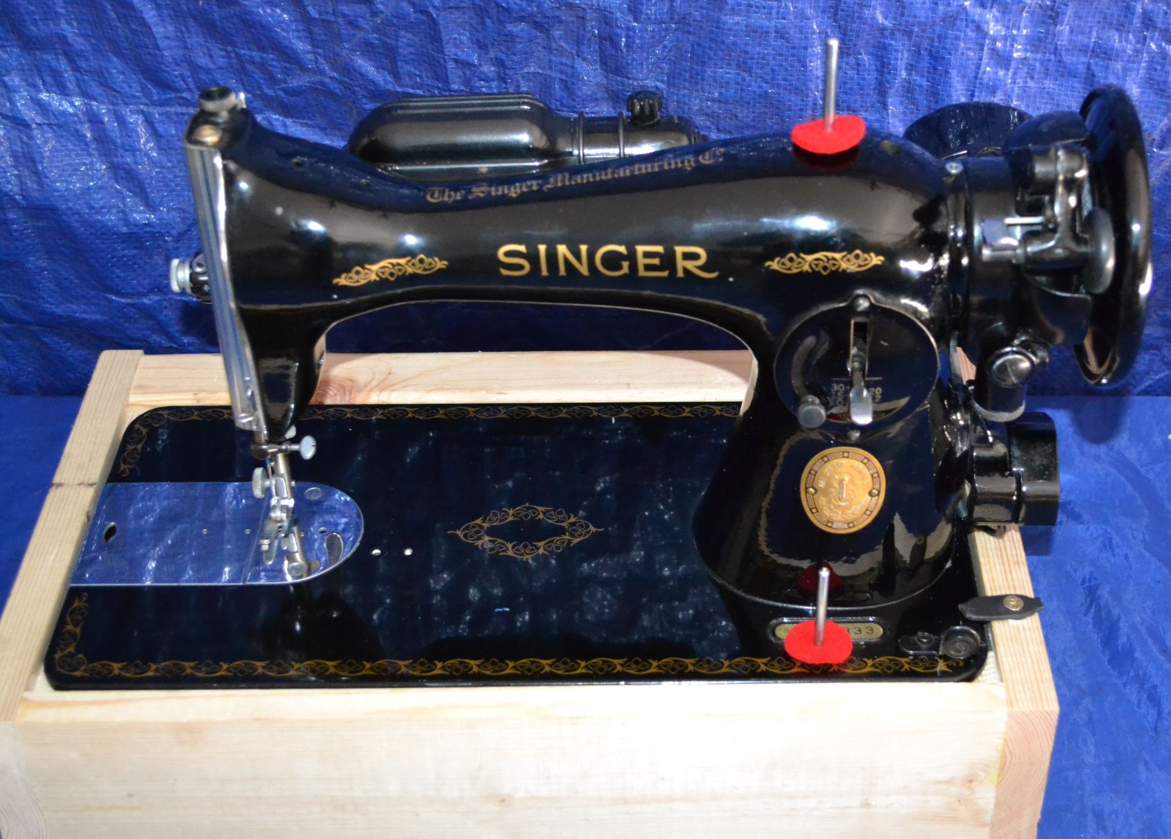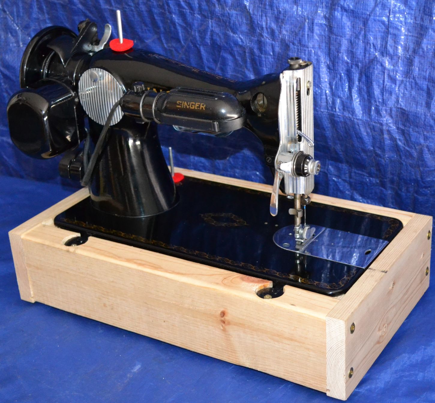 IT ALSO COMES WITH A LOT OF ATTACHMENTS FOR QUILTING, AND SEWING NEEDES. I HAVE SERVICED THS MACHINE, NEW GREASE IN MOTOR MACHINE OILED, NEW POWER WIRE IN MOTOR, NEW DOULBE LEAD FOOT CONTROL/POWER CORD W/SINGER FOOT CONTROL. MACHINE HAS BEEN GONE THROUGH NEW RUBBER WHEEL ON BOBBIN WINDER, NEW WOOD BASE W/HINGES, CUSHIONS, HOLD DOWN, BASE CAN BE STAINED, PAINTED, WALL PAPERED TO YOUR LIKING.