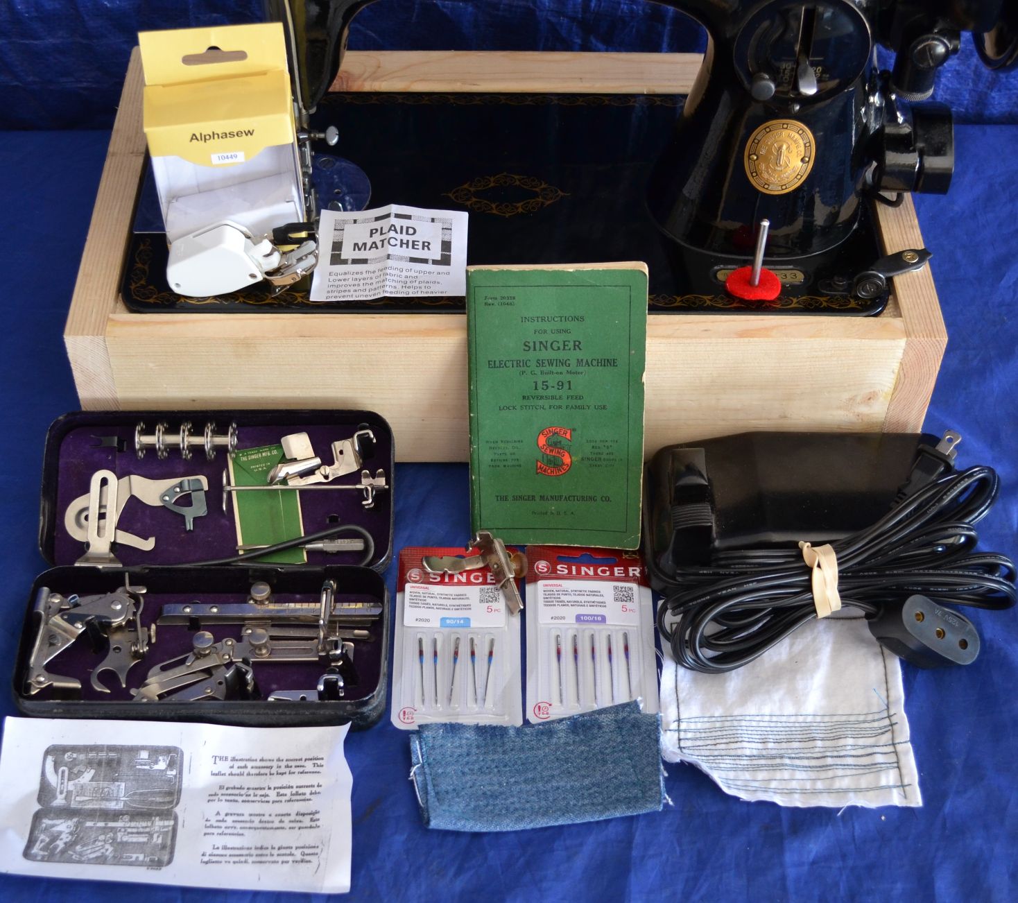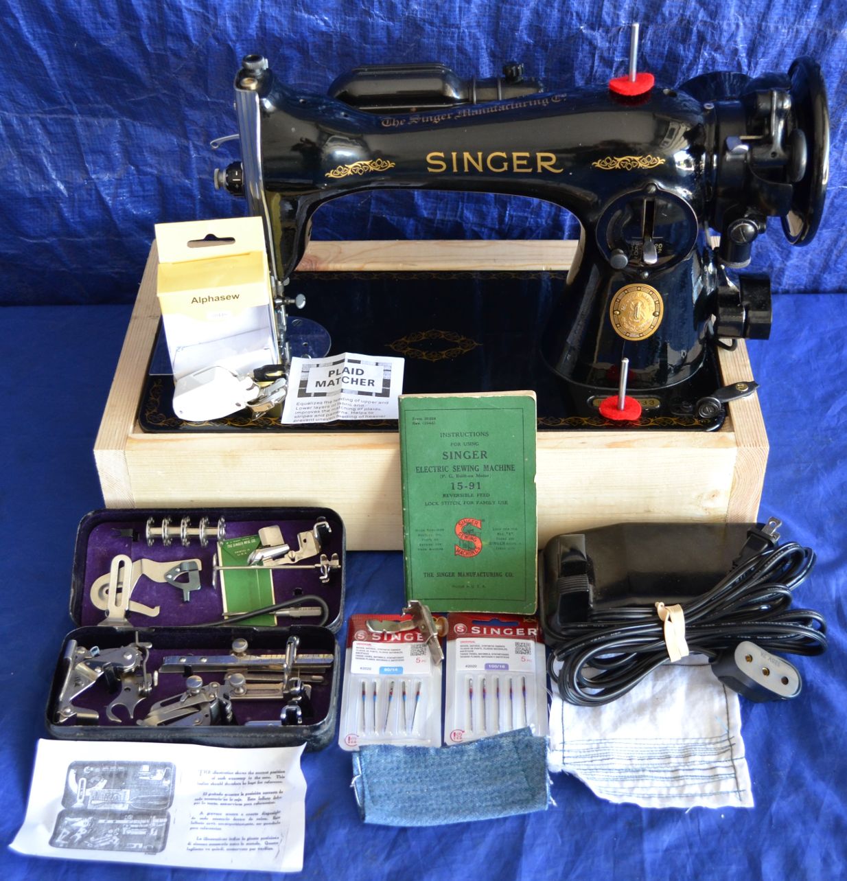 SINGER 15-91 GEAR DRIVE W/NEW BASE, RARE BLACK ATTACHMENT BOX W/ATTACHMENTS, ORIGINAL MANUAL